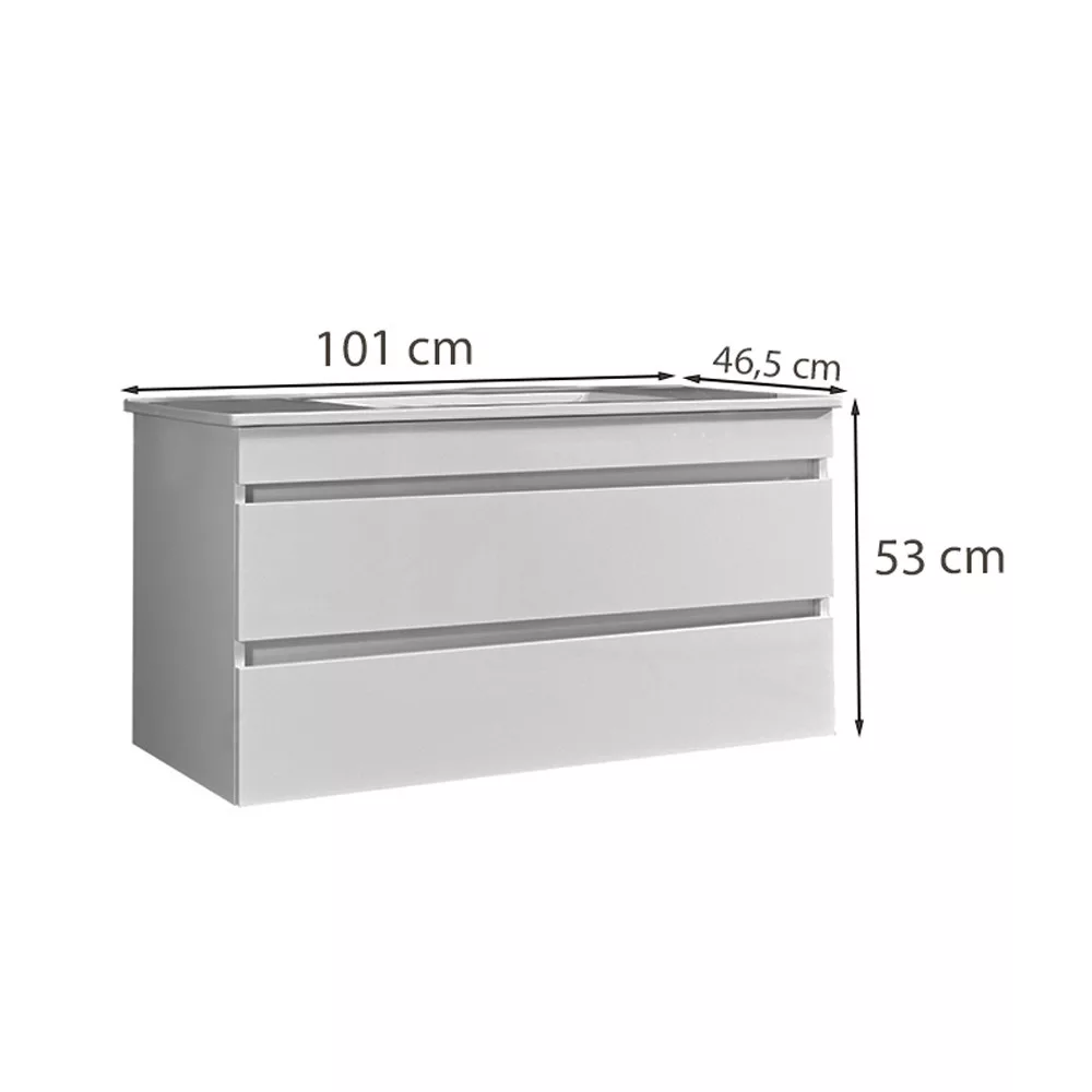 Das Badmöbel verfügt über zwei geräumige Schubladen, in denen Sie Ihre Badutensilien bequem unterbringen können. Durch sein kompaktes Design eignet er sich auch für kleinere Bäder, zum Beispiel in Plattenbauwohnungen. Das Produkt hat eine hochglanzlackierte Front und einen hochglanzlackierten Korpus und wird außerdem mit farblich abgestimmten Kantenschlössern geliefert. Das Badmöbel ist in einer hängenden Version erhältlich .