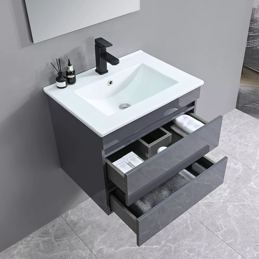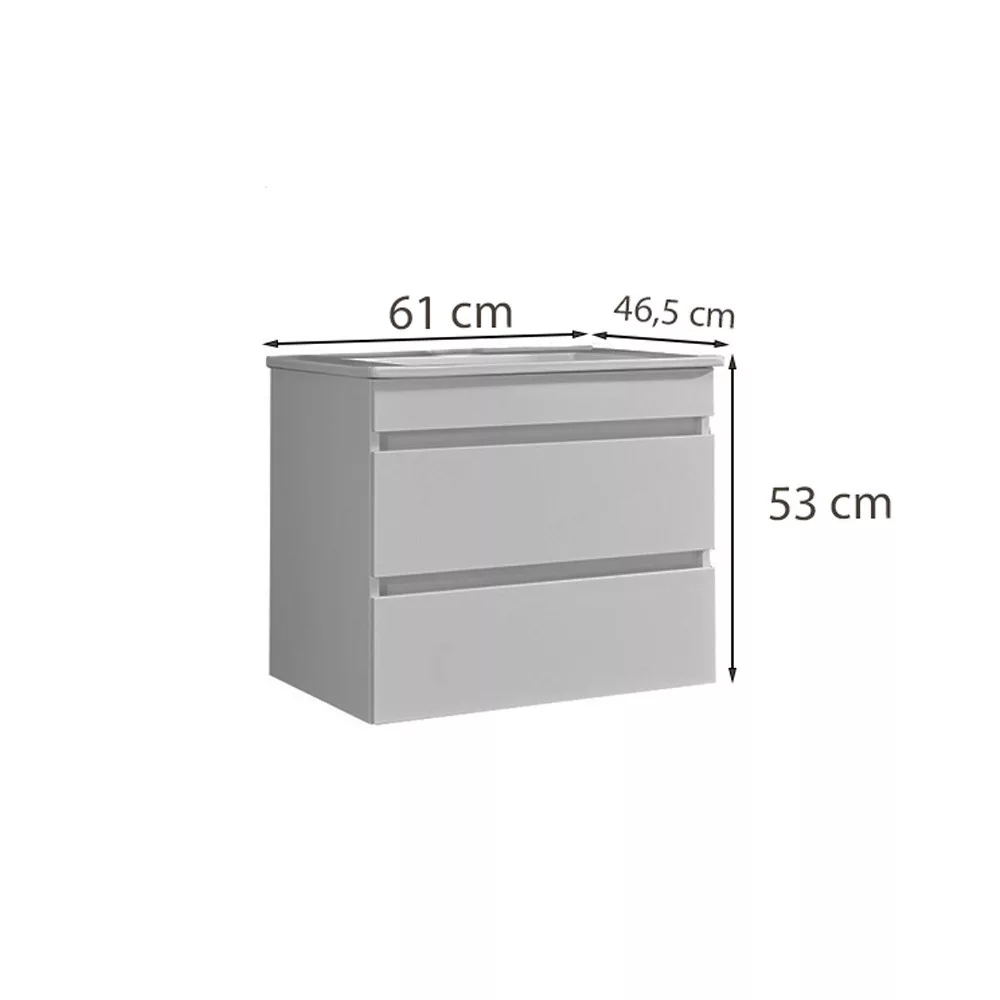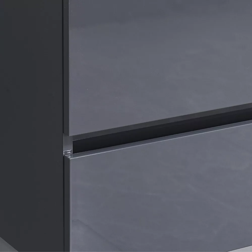 Das Badmöbel nimmt wenig Platz ein, verfügt aber über zwei geräumige Schubladen, in denen Sie Ihre Badutensilien bequem unterbringen können. Dank seiner geringen Stellfläche eignet er sich auch für kleinere Bäder, zum Beispiel in Plattenbauten. Das Produkt hat eine hochglanzlackierte Front und einen lackierten Korpus und wird außerdem mit farblich passenden Kantenschlössern geliefert. Das Badmöbel ist auch in einer hängenden Version erhältlich .