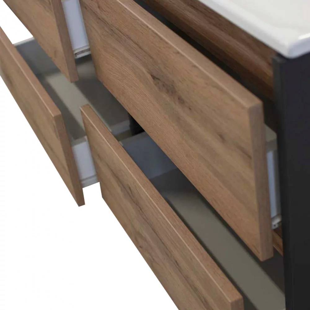 Neben der Funktionalität wurde natürlich auch demAussehen des Möbels große Aufmerksamkeit gewidmet . Dank seiner anthrazitfarbenen Landhaus-Eiche und seiner klaren, modernen Linien schafft es eine harmonische Atmosphäre in jedem Badezimmer.