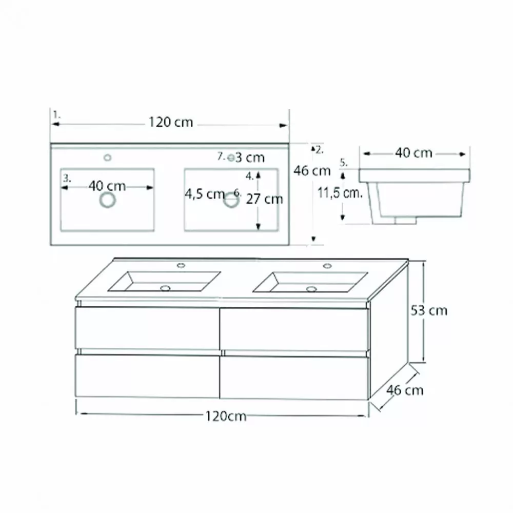Zum Paket gehört auch ein Doppelwaschbecken aus Keramik in Weiß, das perfekt auf das Möbelstück passt und Platz für zwei Wasserhähne bietet. Sie brauchen also nicht nach einem passenden Waschbecken zu suchen - das Paket enthält alles, was Sie dazu brauchen (außer den Wasserhähnen).