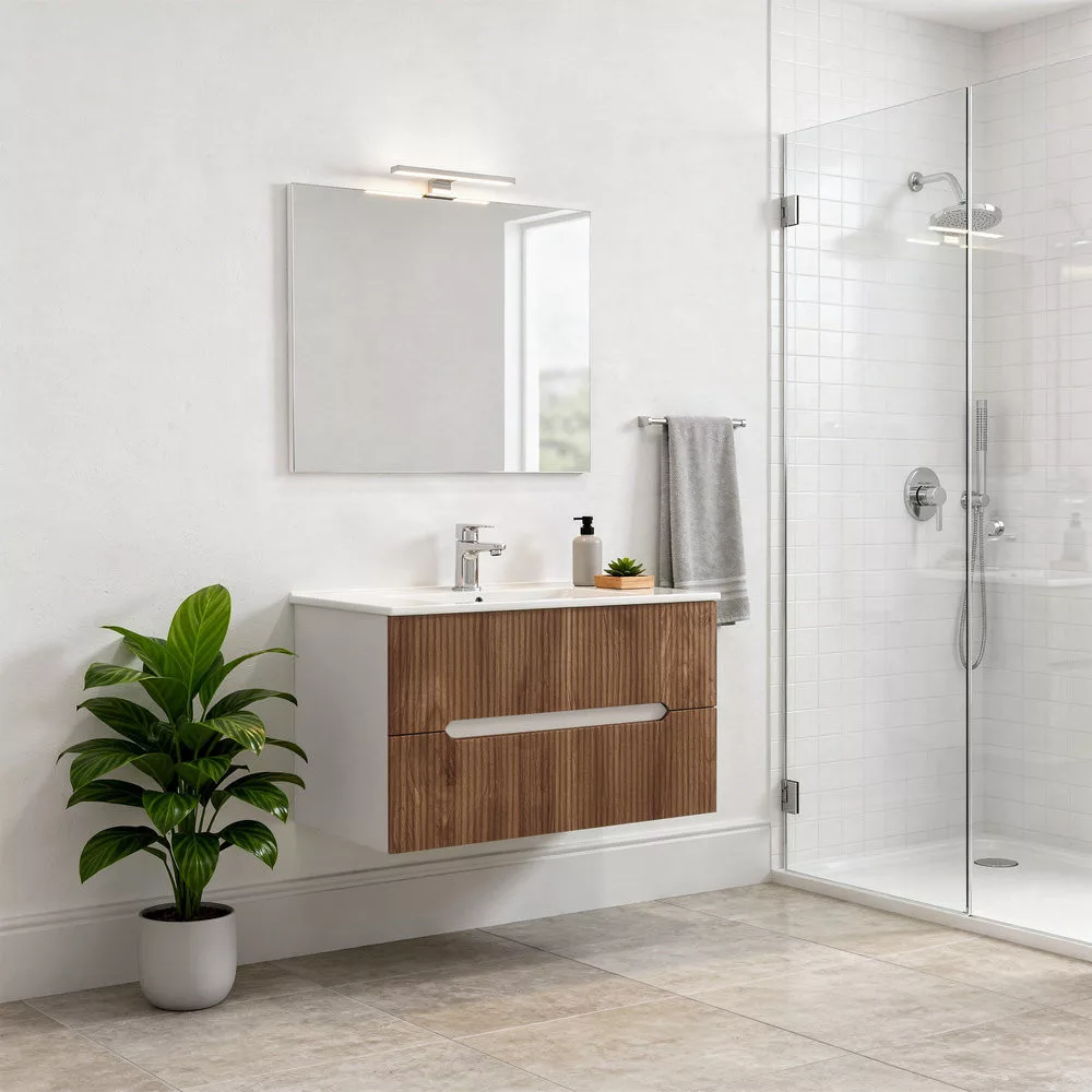 Die Badmöbel Leziter Trent vereinen Ästhetik und Zweckmäßigkeit auf harmonische Weise. Die gerippte Front verleiht ihm einen klaren, modernen Charakter, während der integrierte Griff eine bequeme Handhabung ermöglicht. Die Wandbefestigung sorgt für eine mühelose Optik und eine schnellere Reinigung des Bodens. Das Keramikwaschbecken ist langlebig, zeitlos, widerstandsfähig gegen alltägliche Abnutzung und leicht sauber zu halten.