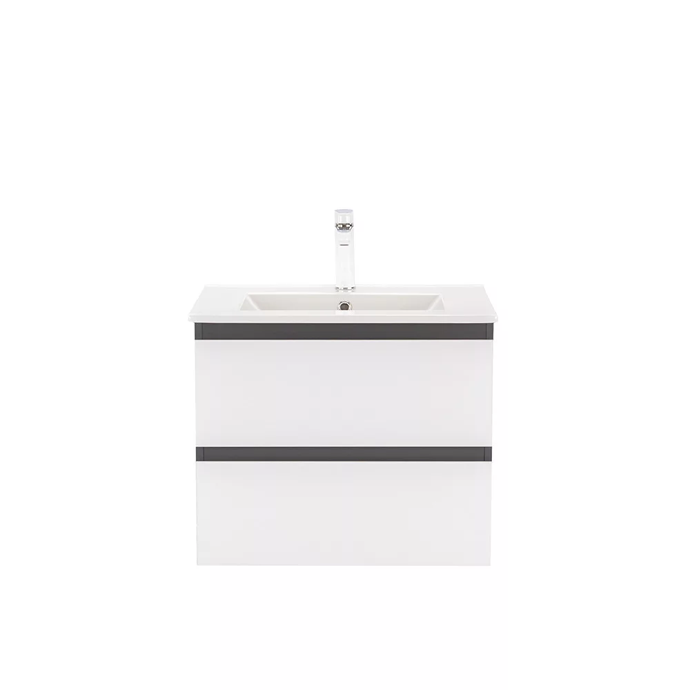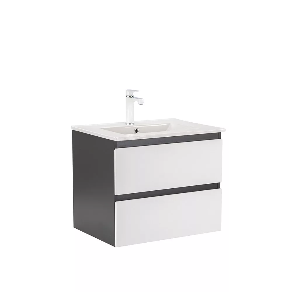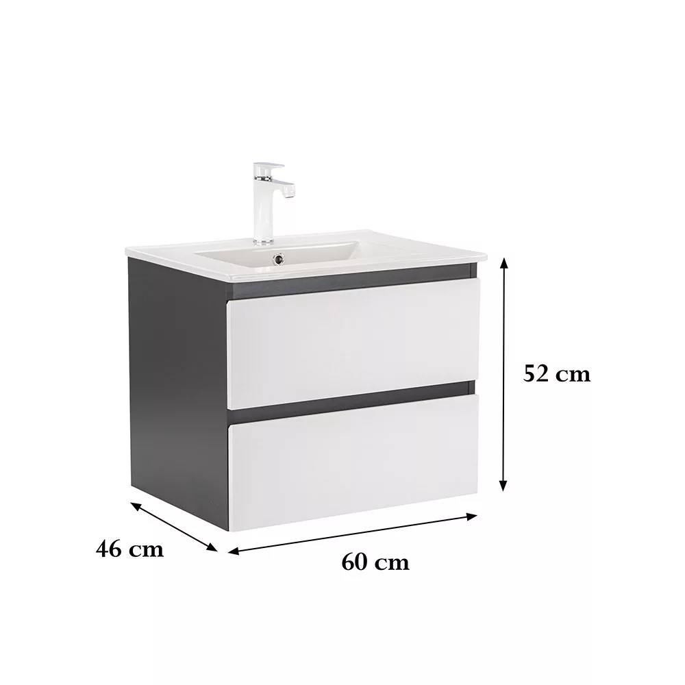 Das komplette Badmöbel Vario Forte 60 ist eine stilvolle und praktische Wahl für moderne Bäder. Seine kompakten Abmessungen machen ihn ideal für kleine bis mittelgroße Bäder, der 45-Grad-Kantenabschluss sorgt für einen modernen Effekt und das anthrazitweiße Design verleiht dem Raum einen eleganten Look. Der gedämpfte Schubladenverschluss und das hängende Design bieten Komfort und einfache Reinigung, während die hochwertigen Materialien eine lange Lebensdauer gewährleisten.