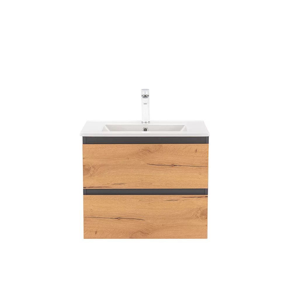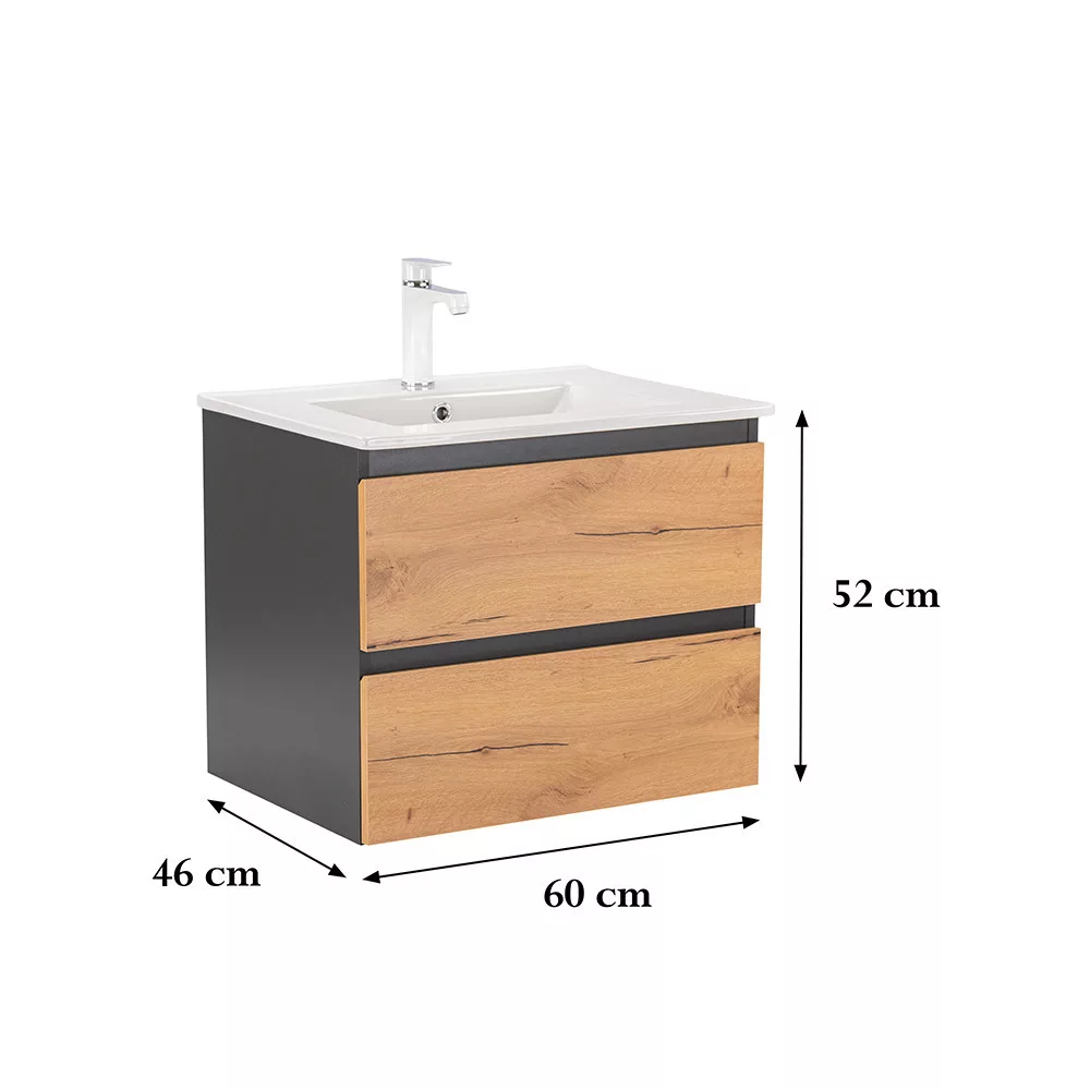 Das komplette Badmöbel Vario Forte 60 ist eine stilvolle und praktische Wahl für moderne Bäder. Seine kompakten Abmessungen machen ihn ideal für kleine bis mittelgroße Bäder, der 45-Grad-Kantenabschluss sorgt für einen modernen Effekt und das anthrazitfarbene Eichendesign verleiht dem Raum ein schickes Aussehen. Der gedämpfte Schubladenverschluss und das hängende Design bieten Komfort und einfache Reinigung, während die hochwertigen Materialien eine lange Lebensdauer gewährleisten.