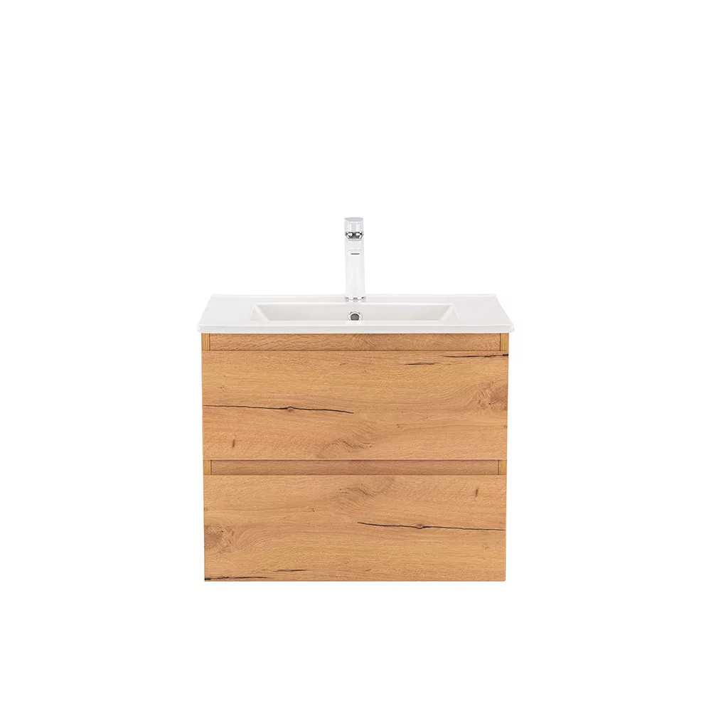 Das komplette Badmöbel Vario Forte 60 ist eine stilvolle und praktische Wahl für moderne Bäder. Seine kompakten Abmessungen machen ihn ideal für kleine bis mittelgroße Bäder, der 45-Grad-Kantenabschluss sorgt für einen modernen Effekt und das Farbdesign in Eiche-Eiche verleiht dem Raum ein elegantes Aussehen. Der gedämpfte Schubladenverschluss und das hängende Design bieten Komfort und einfache Reinigung, während die hochwertigen Materialien eine lange Lebensdauer gewährleisten.