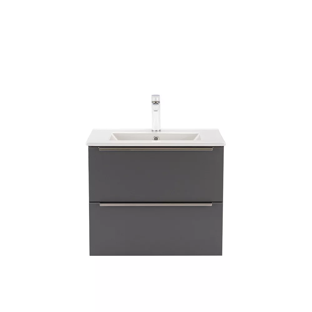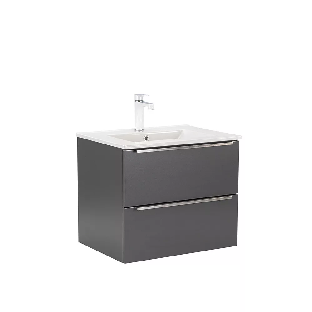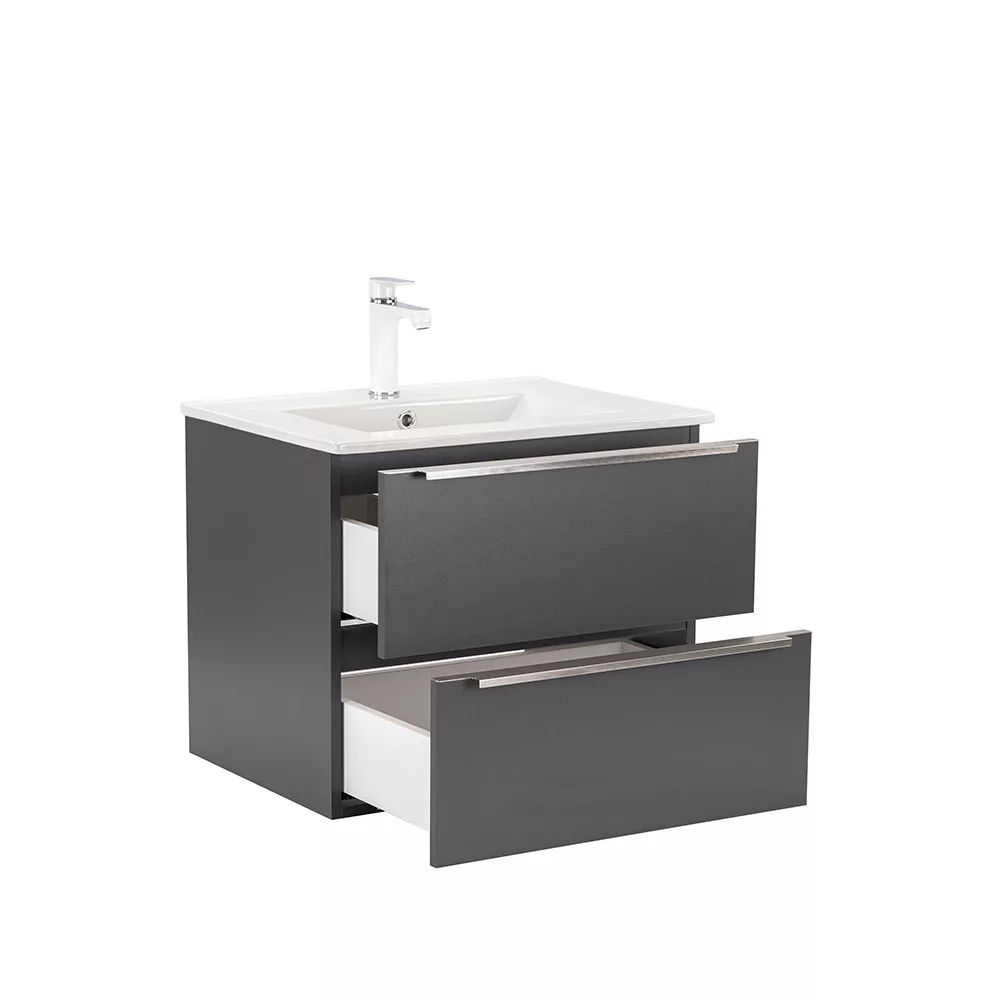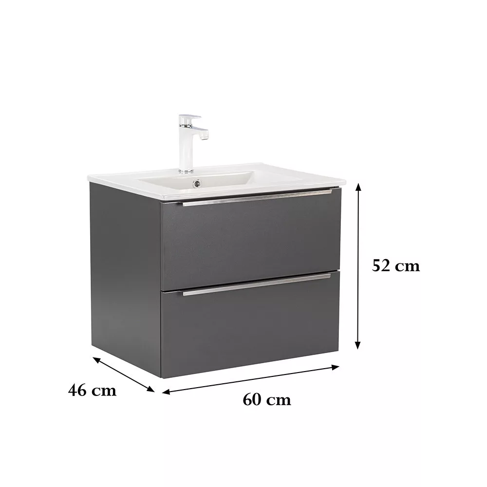 Das komplette Badmöbel Vario Trim 60 ist eine stilvolle und praktische Wahl für moderne Bäder. Dank seiner kompakten Abmessungen eignet er sich ideal für kleine bis mittelgroße Bäder. Das Griffprofil aus Metall sorgt für einen Patina-Effekt, während das anthrazit-anthrazitfarbene Design dem Raum einen eleganten Look verleiht. Der gedämpfte Schubladenverschluss und das hängende Design sorgen für Komfort und einfache Reinigung, während die hochwertigen Materialien eine lange Lebensdauer garantieren.
