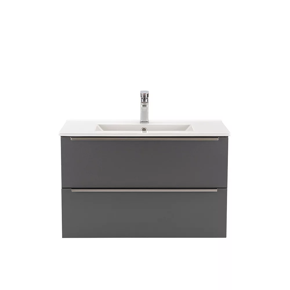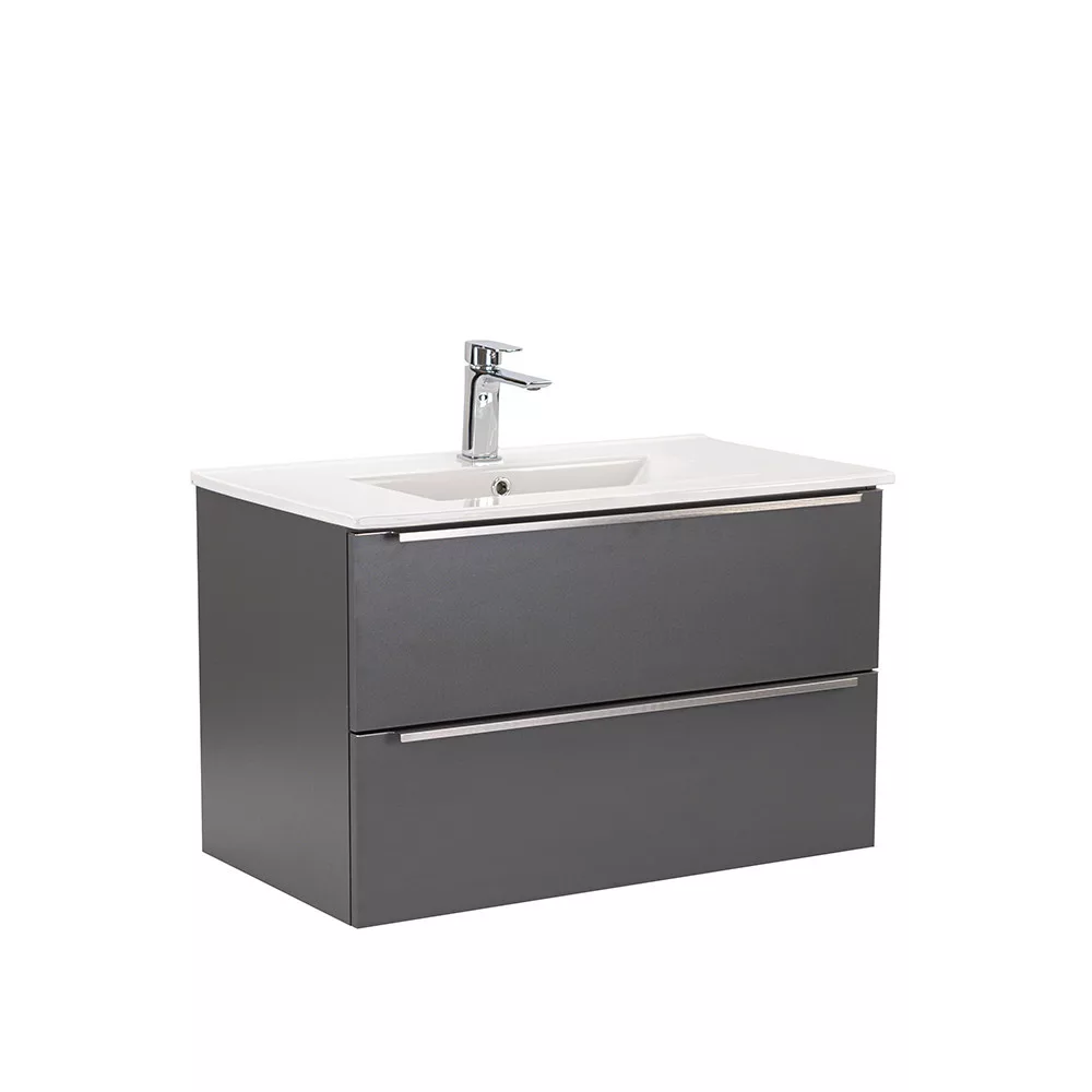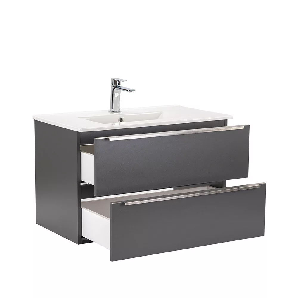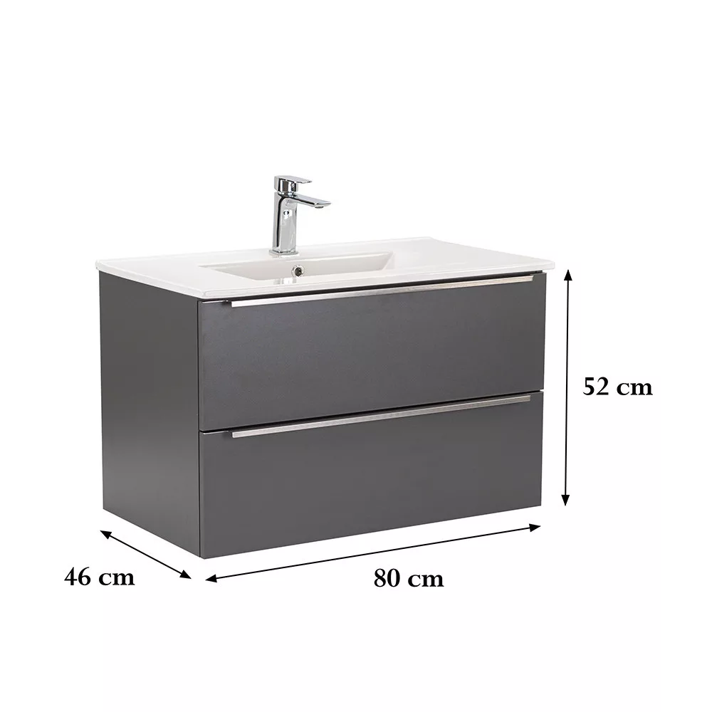Das komplette Badmöbel Vario Trim 80 ist eine stilvolle und praktische Wahl für moderne Bäder. Dank seiner kompakten Abmessungen eignet er sich ideal für kleine bis mittelgroße Bäder. Das Griffprofil aus Metall sorgt für einen Patina-Effekt, während das anthrazit-anthrazitfarbene Design dem Raum einen eleganten Look verleiht. Der gedämpfte Schubladenverschluss und das hängende Design sorgen für Komfort und einfache Reinigung, während die hochwertigen Materialien eine lange Lebensdauer garantieren.
