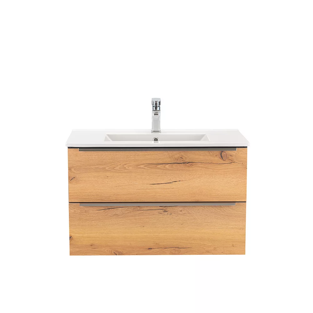 Das komplette Badmöbel Vario Trim 80 ist eine stilvolle und praktische Wahl für moderne Bäder. Seine kompakten Abmessungen machen ihn ideal für kleine bis mittelgroße Bäder. Das Griffprofil aus Metall verleiht ihm einen Patina-Effekt, während das anthrazitfarbene Eichendesign dem Raum einen eleganten Look verleiht. Der gedämpfte Schubladenverschluss und das hängende Design sorgen für Komfort und einfache Reinigung, während die hochwertigen Materialien eine lange Lebensdauer gewährleisten.
