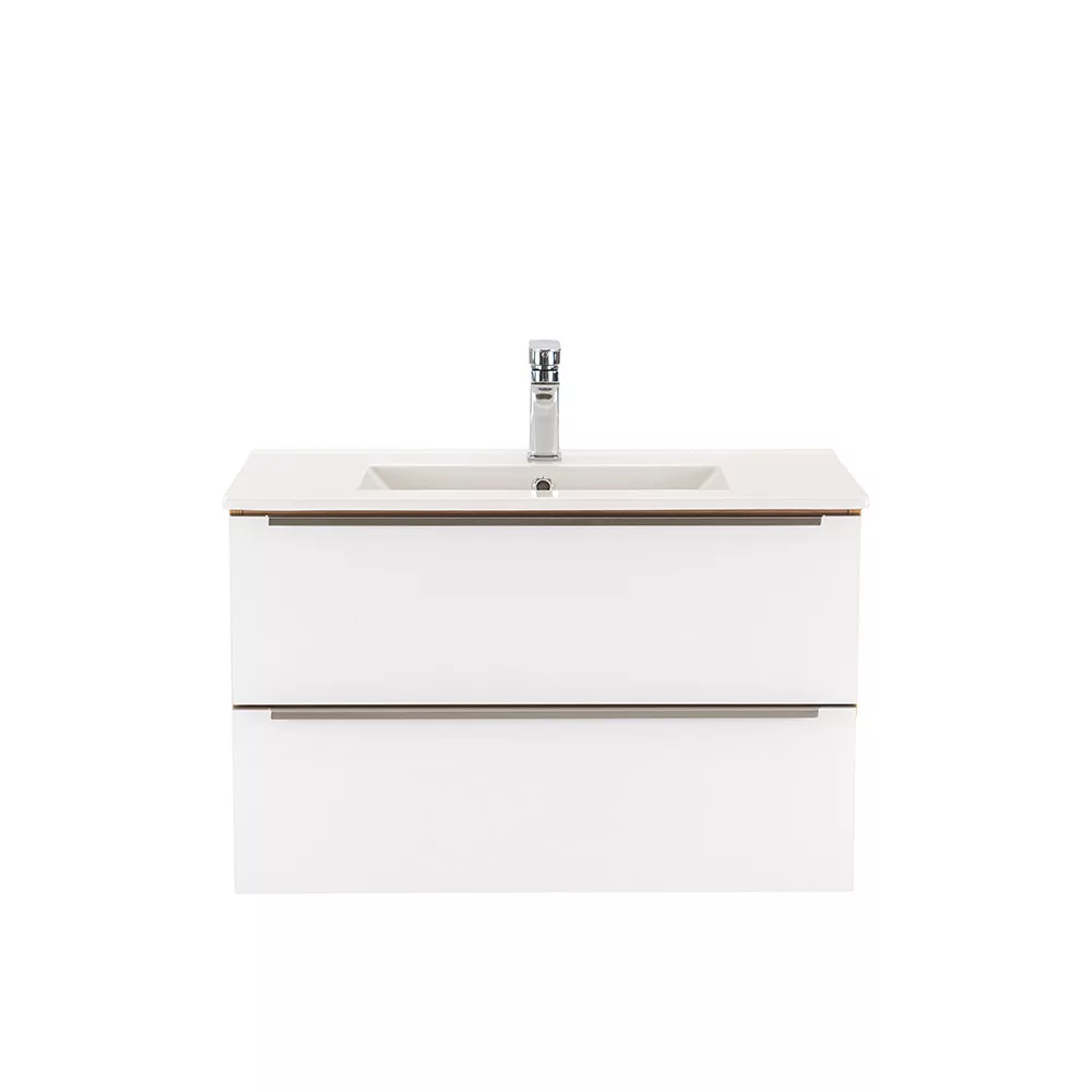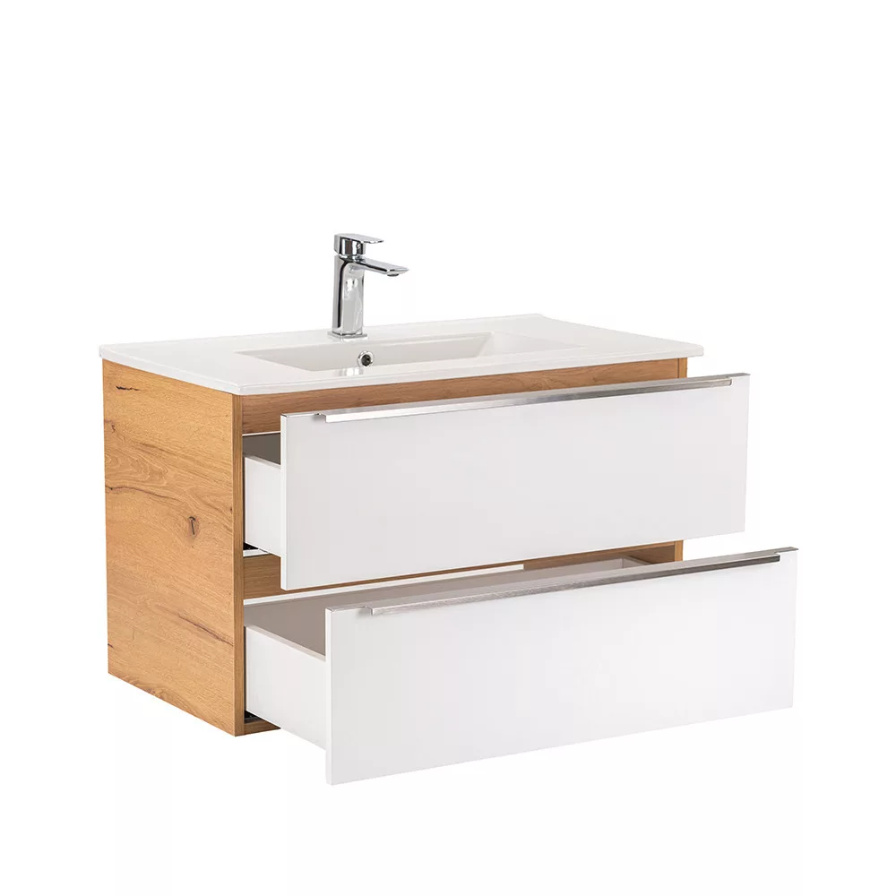 Das komplette Badmöbel Vario Trim 80 ist eine stilvolle und praktische Wahl für moderne Bäder. Seine kompakten Abmessungen machen ihn ideal für kleine bis mittelgroße Bäder. Das Metallgriffprofil verleiht ihm einen Patina-Effekt, während das Design in Eiche und Weiß dem Raum ein elegantes Aussehen verleiht. Der gedämpfte Schubladenverschluss und das hängende Design sorgen für Komfort und einfache Reinigung, während die hochwertigen Materialien eine lange Lebensdauer gewährleisten.