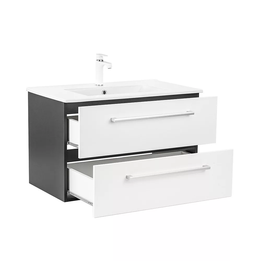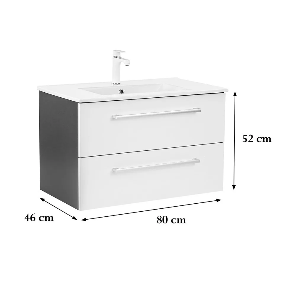 Der Unterschrank Vario Clam 80 ist eine stilvolle und praktische Wahl für moderne Bäder. Mit seinen kompakten Abmessungen ist er ideal für kleine bis mittelgroße Bäder. Das Griffprofil aus Metall verleiht ihm einen Patina-Effekt, während das anthrazit-weiße Design dem Raum einen eleganten Look verleiht. Der gedämpfte Schubladenverschluss und das hängende Design sorgen für Komfort und einfache Reinigung, während die hochwertigen Materialien eine lange Lebensdauer gewährleisten.