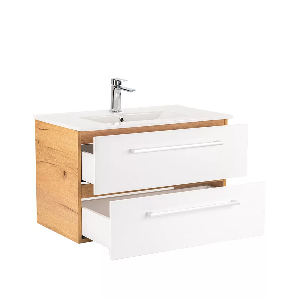 Der Unterschrank Vario Clam 80 ist eine stilvolle und praktische Wahl für moderne Bäder. Seine kompakten Abmessungen machen ihn ideal für kleine bis mittelgroße Bäder, und das Metallgriffprofil verleiht ihm einen Patina-Effekt, während das Design in Eiche und Weiß dem Raum ein elegantes Aussehen verleiht. Der gedämpfte Schubladenverschluss und das hängende Design sorgen für Komfort und einfache Reinigung, während die hochwertigen Materialien eine lange Lebensdauer gewährleisten.