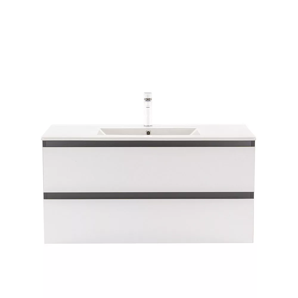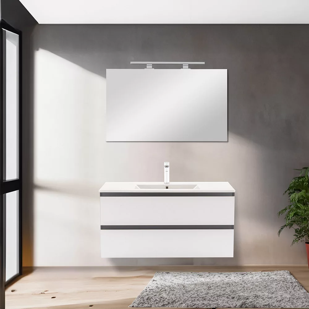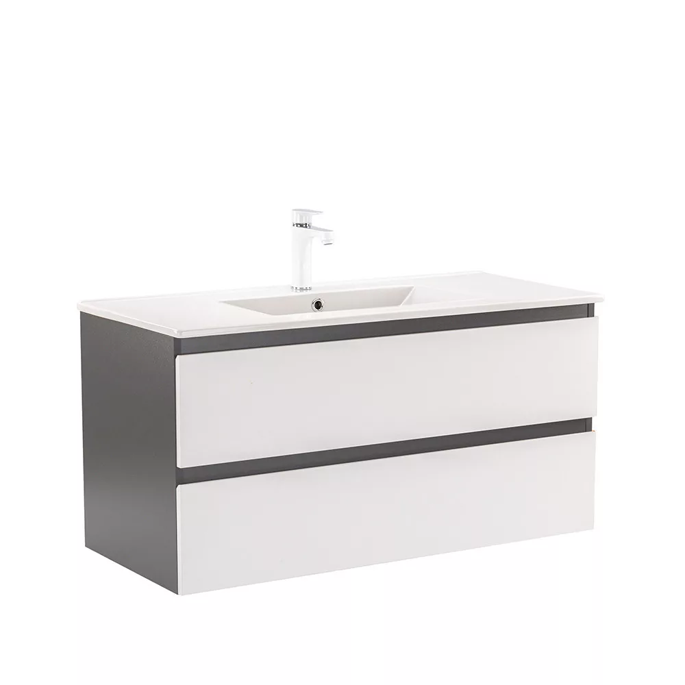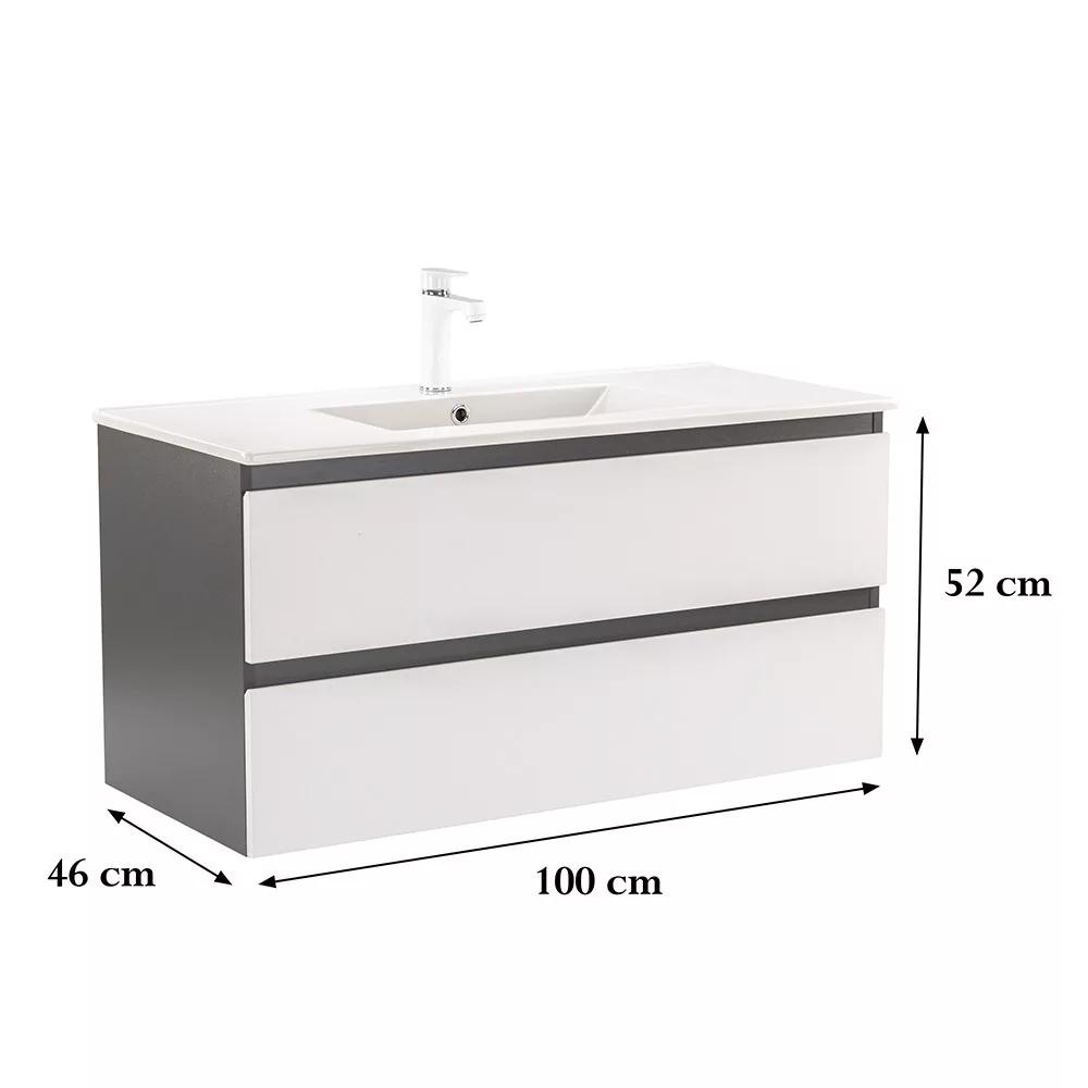 Das komplette Badmöbel Vario Forte 100 ist eine stilvolle und praktische Wahl für moderne Bäder. Seine kompakten Abmessungen machen ihn ideal für kleine bis mittelgroße Bäder, der 45-Grad-Kantenabschluss sorgt für einen modernen Effekt und das anthrazitweiße Design verleiht dem Raum einen schicken Look. Der gedämpfte Schubladenverschluss und das hängende Design bieten Komfort und einfache Reinigung, während die hochwertigen Materialien eine lange Lebensdauer gewährleisten.