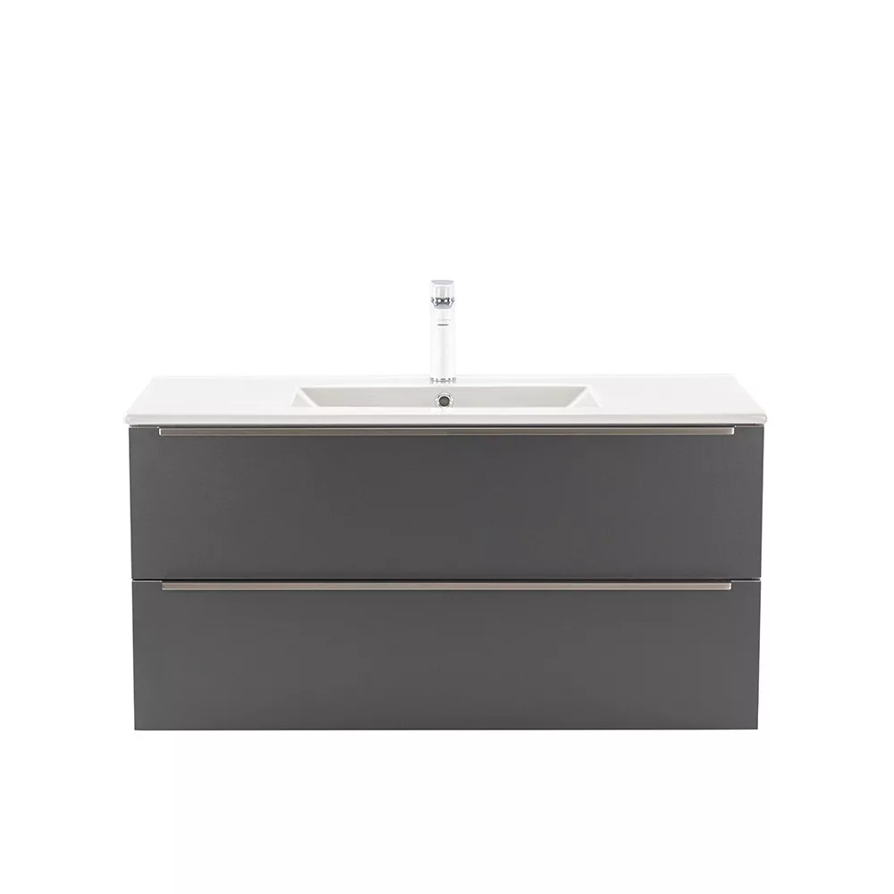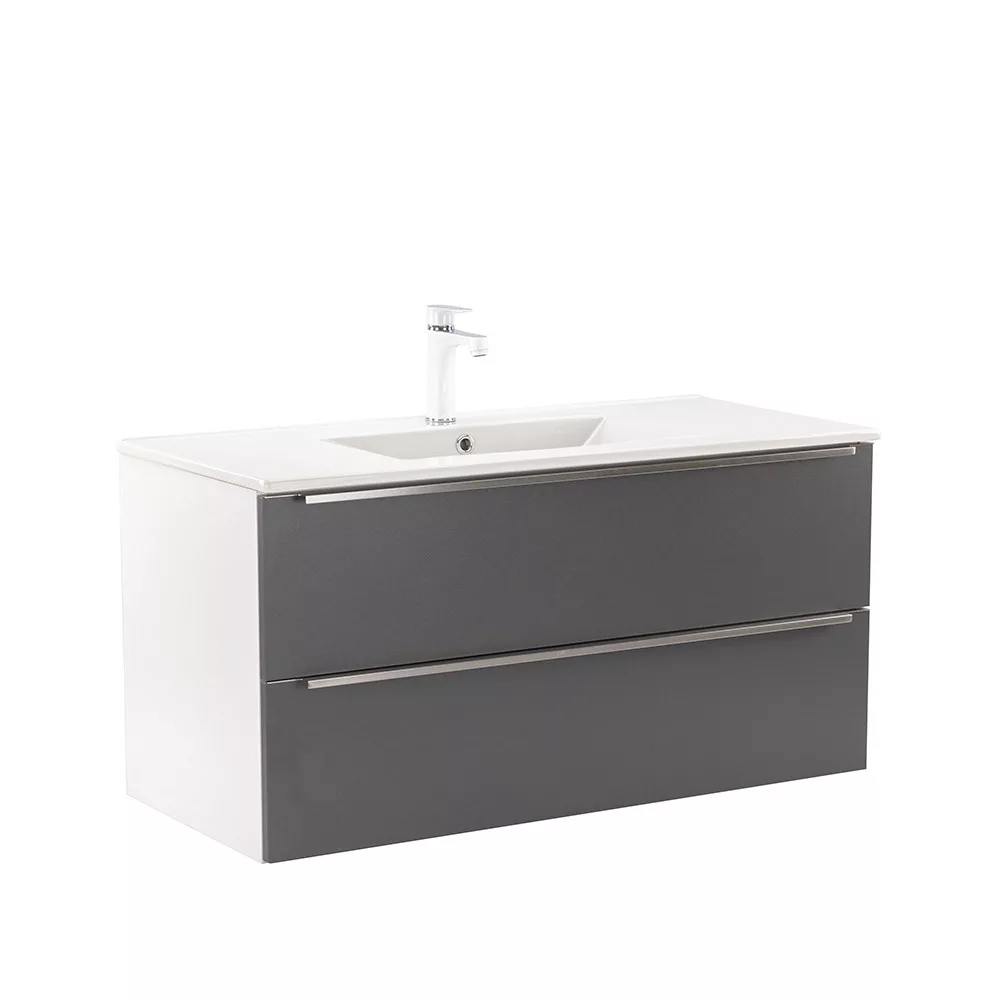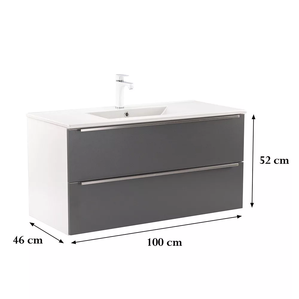 Der Unterschrank Vario Trim 100 ist eine stilvolle und praktische Wahl für moderne Bäder. Seine kompakten Abmessungen machen ihn ideal für kleine bis mittelgroße Bäder. Das Griffprofil aus Metall verleiht ihm einen Patina-Effekt, während das Design in Weiß und Anthrazit dem Raum einen eleganten Look verleiht. Der gedämpfte Schubladenverschluss und das hängende Design sorgen für Komfort und einfache Reinigung, während die hochwertigen Materialien eine lange Lebensdauer gewährleisten.