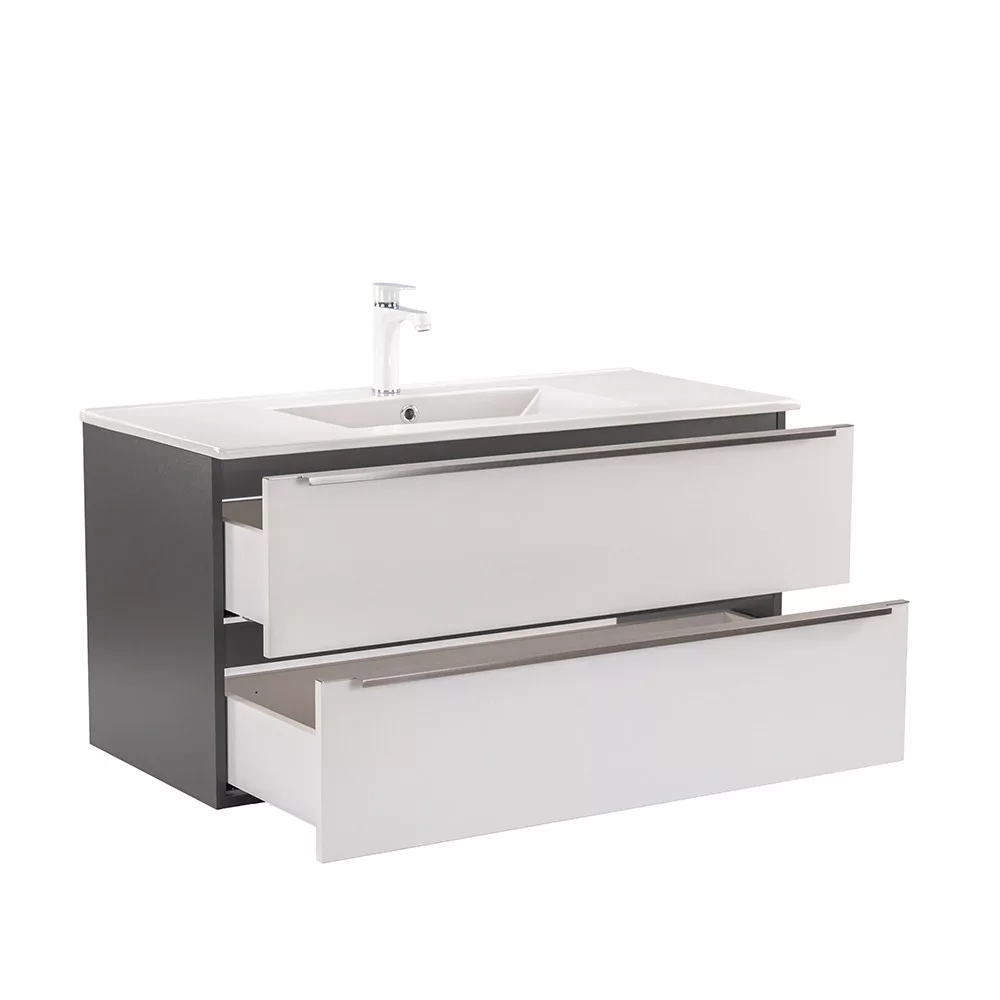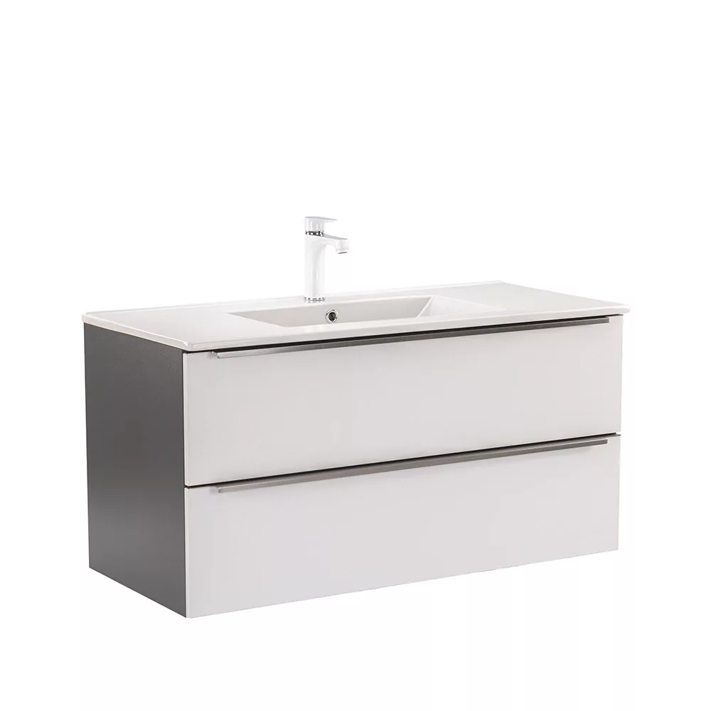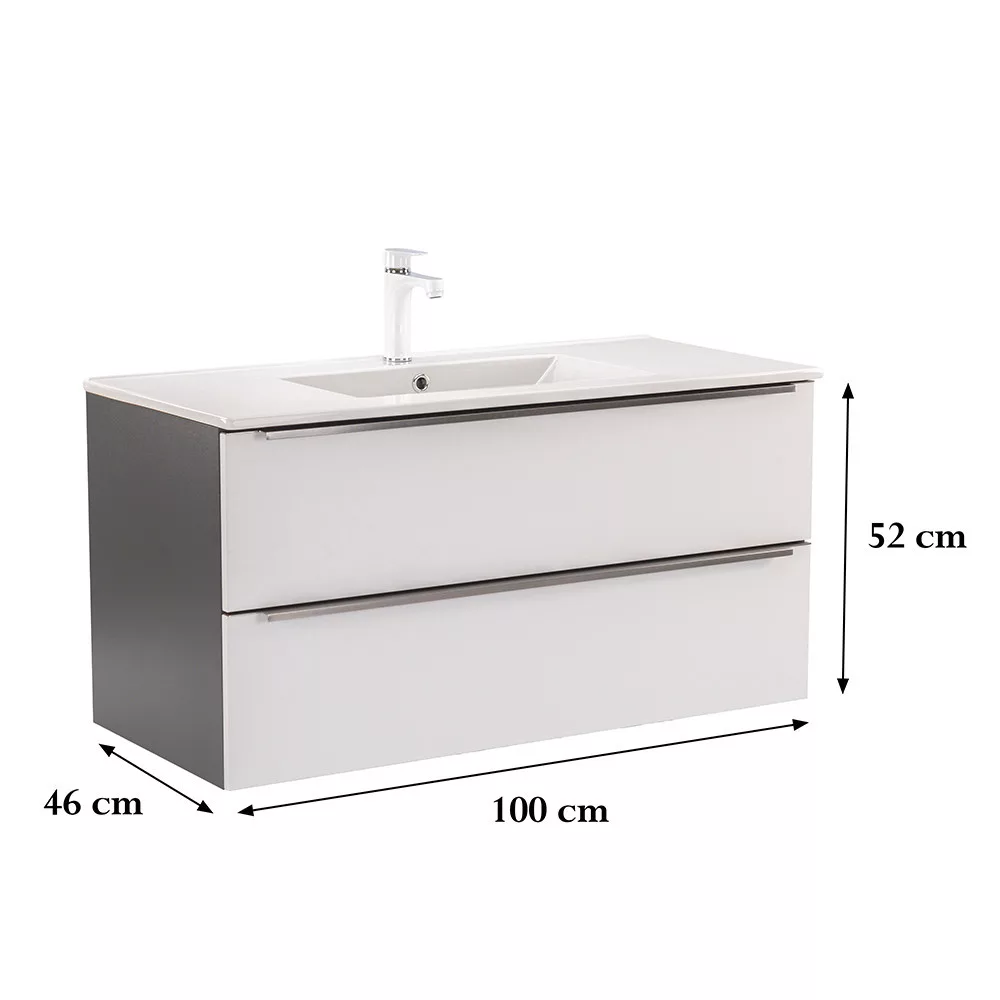 Der Unterschrank Vario Trim 100 ist eine stilvolle und praktische Wahl für moderne Bäder. Mit seinen kompakten Abmessungen ist er ideal für kleine bis mittelgroße Bäder. Das Griffprofil aus Metall verleiht ihm einen Patina-Effekt, während das anthrazit-weiße Design dem Raum einen eleganten Look verleiht. Der gedämpfte Schubladenverschluss und das hängende Design sorgen für Komfort und einfache Reinigung, während die hochwertigen Materialien eine lange Lebensdauer gewährleisten.