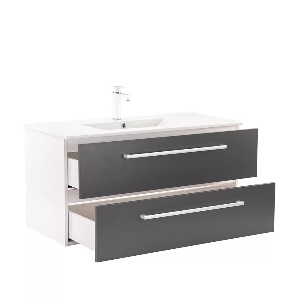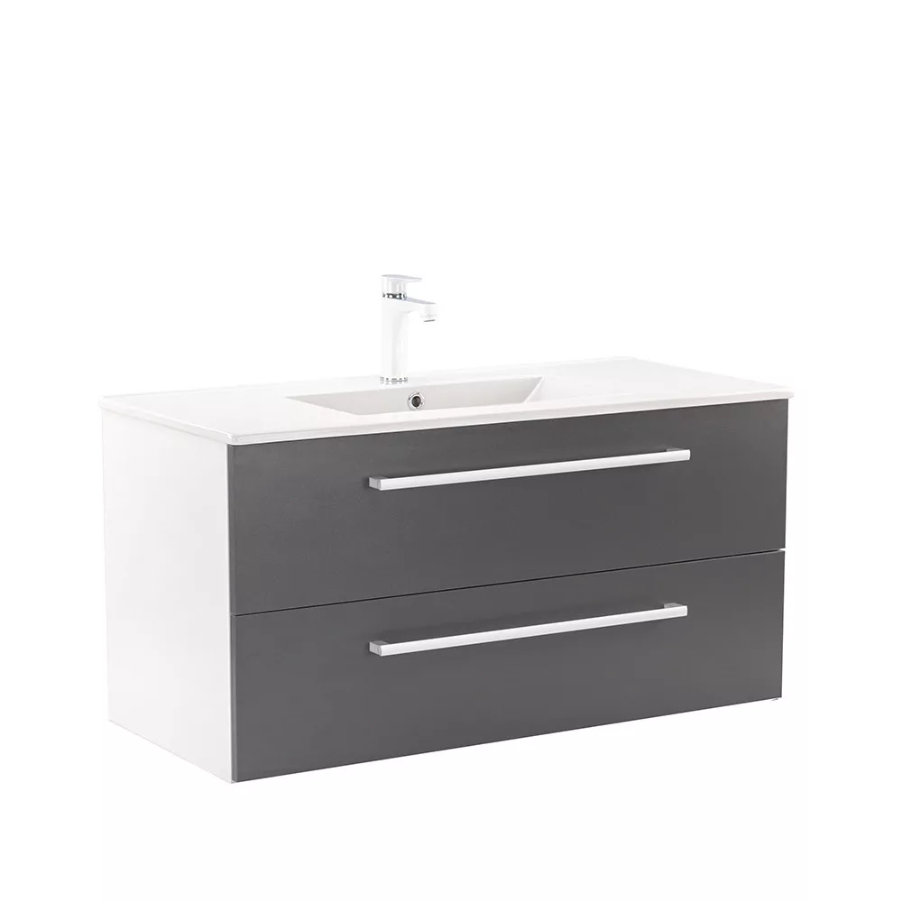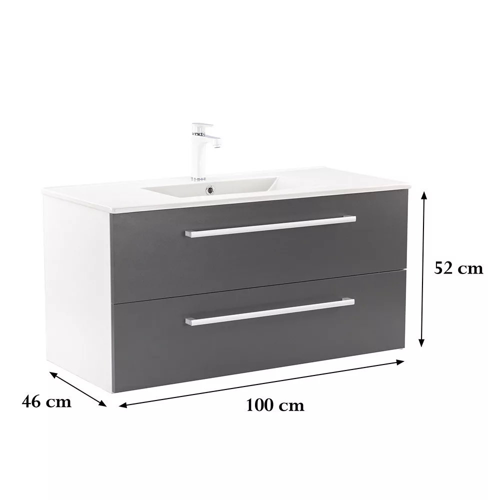 Der Unterschrank Vario Clam 100 ist eine stilvolle und praktische Wahl für moderne Bäder. Seine kompakten Abmessungen machen ihn ideal für kleine bis mittelgroße Bäder. Das Griffprofil aus Metall verleiht ihm einen Patina-Effekt, während das Design in Weiß und Anthrazit dem Raum einen eleganten Look verleiht. Der gedämpfte Schubladenverschluss und das hängende Design sorgen für Komfort und einfache Reinigung, während die hochwertigen Materialien eine lange Lebensdauer gewährleisten.
