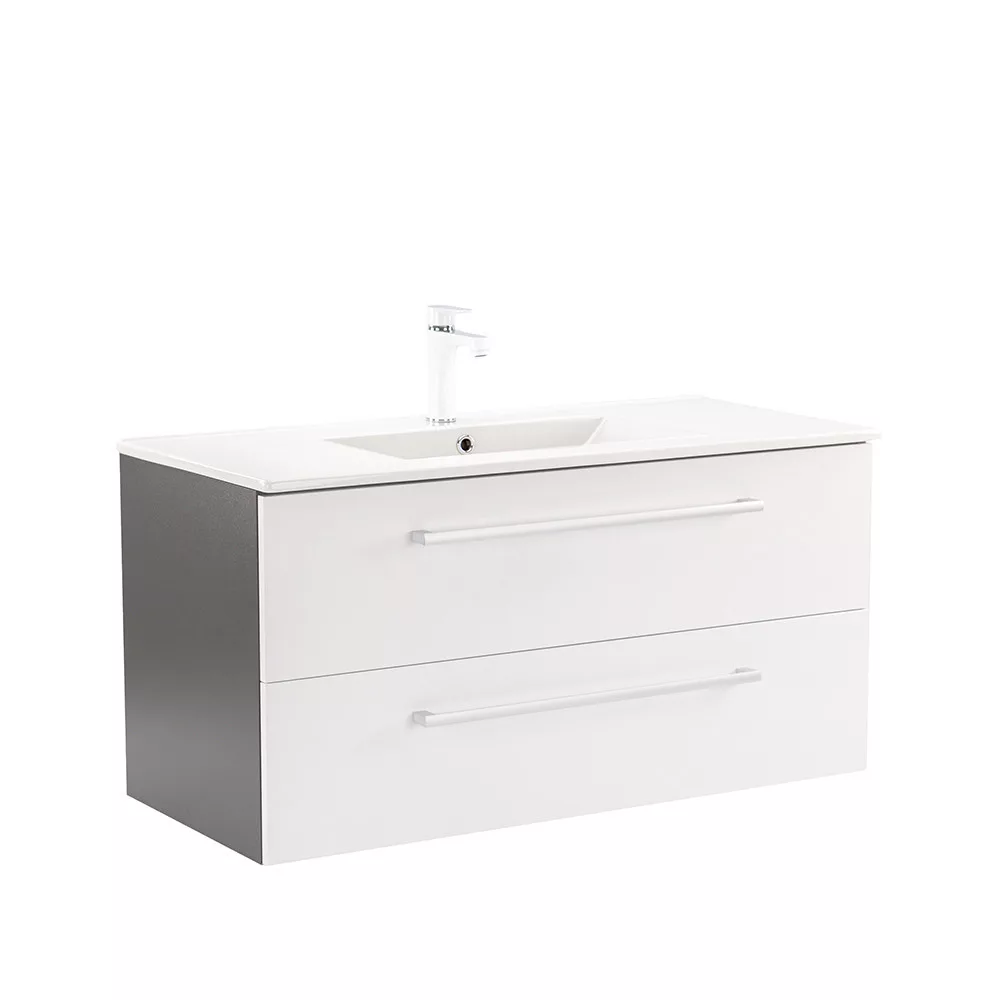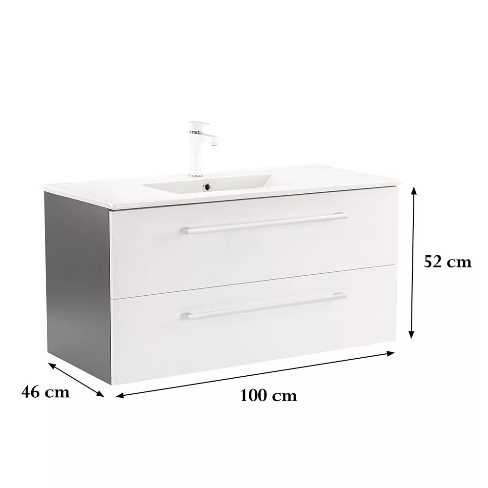 Der Unterschrank Vario Clam 100 ist eine stilvolle und praktische Wahl für moderne Bäder. Seine kompakten Abmessungen machen ihn ideal für kleine bis mittelgroße Bäder. Das Griffprofil aus Metall verleiht ihm einen Patina-Effekt, während das anthrazit-weiße Design dem Raum einen eleganten Look verleiht. Der gedämpfte Schubladenverschluss und das hängende Design sorgen für Komfort und einfache Reinigung, während die hochwertigen Materialien eine lange Lebensdauer gewährleisten.