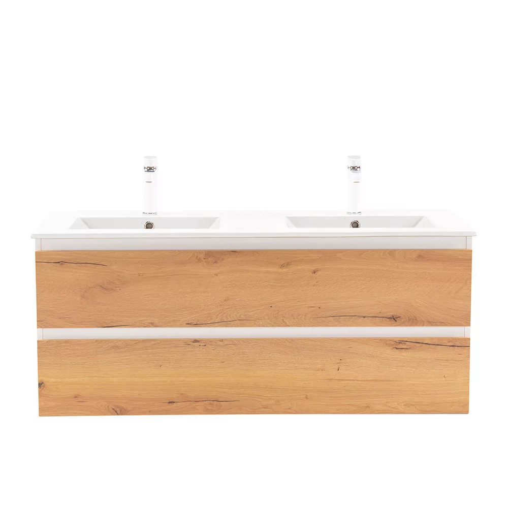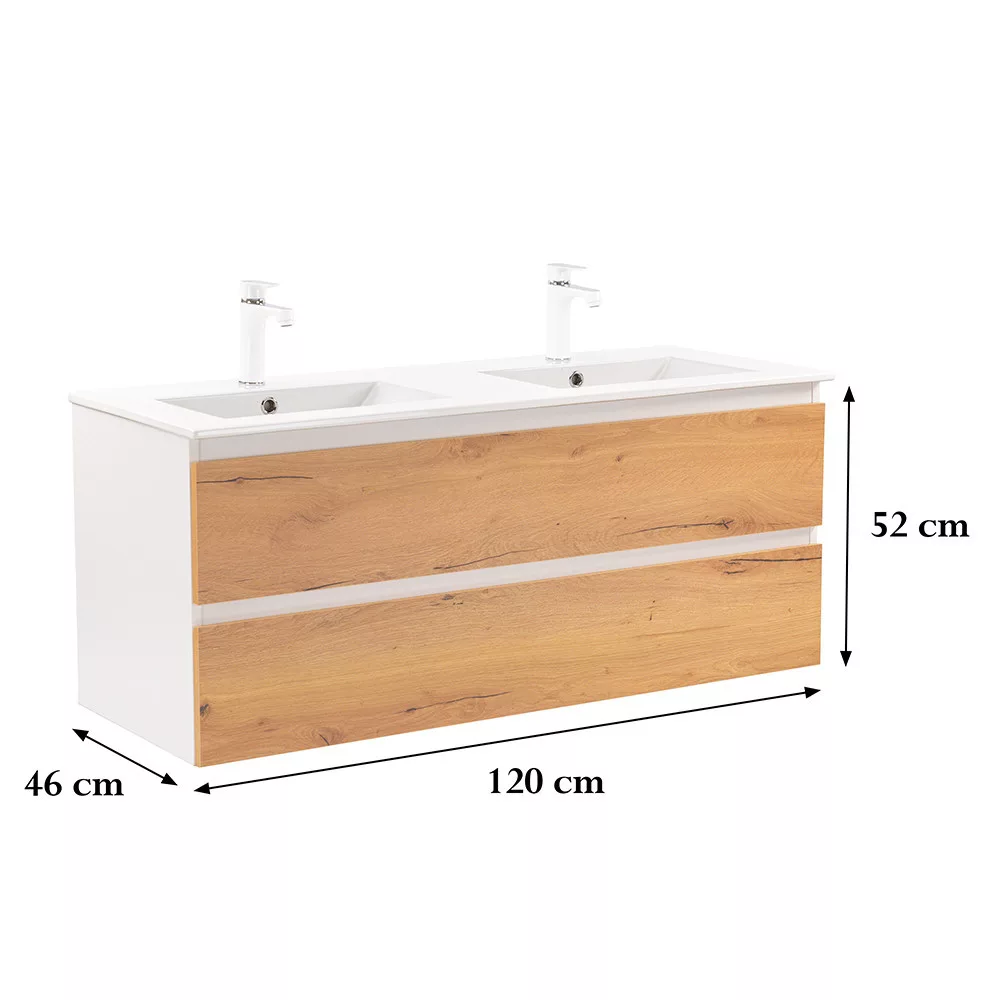 Das Möbel ist mit einem flachen Keramik-Waschtischmit Doppelbecken ausgestattet. Es ist modern, ästhetisch und leicht zu reinigen.