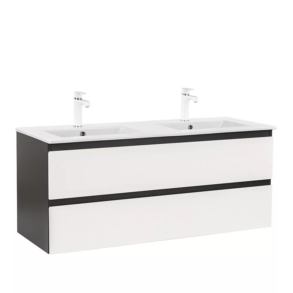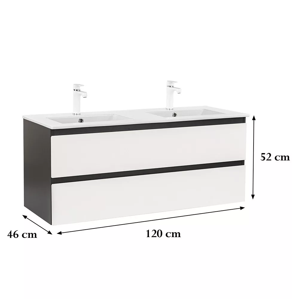 Das Möbel wird mit einem flachen Design-Keramik-Waschtischmit zwei Waschbecken geliefert. Das Waschbecken mit zwei Waschbecken mit zwei Fächern ist modern, ästhetisch und leicht zu reinigen.