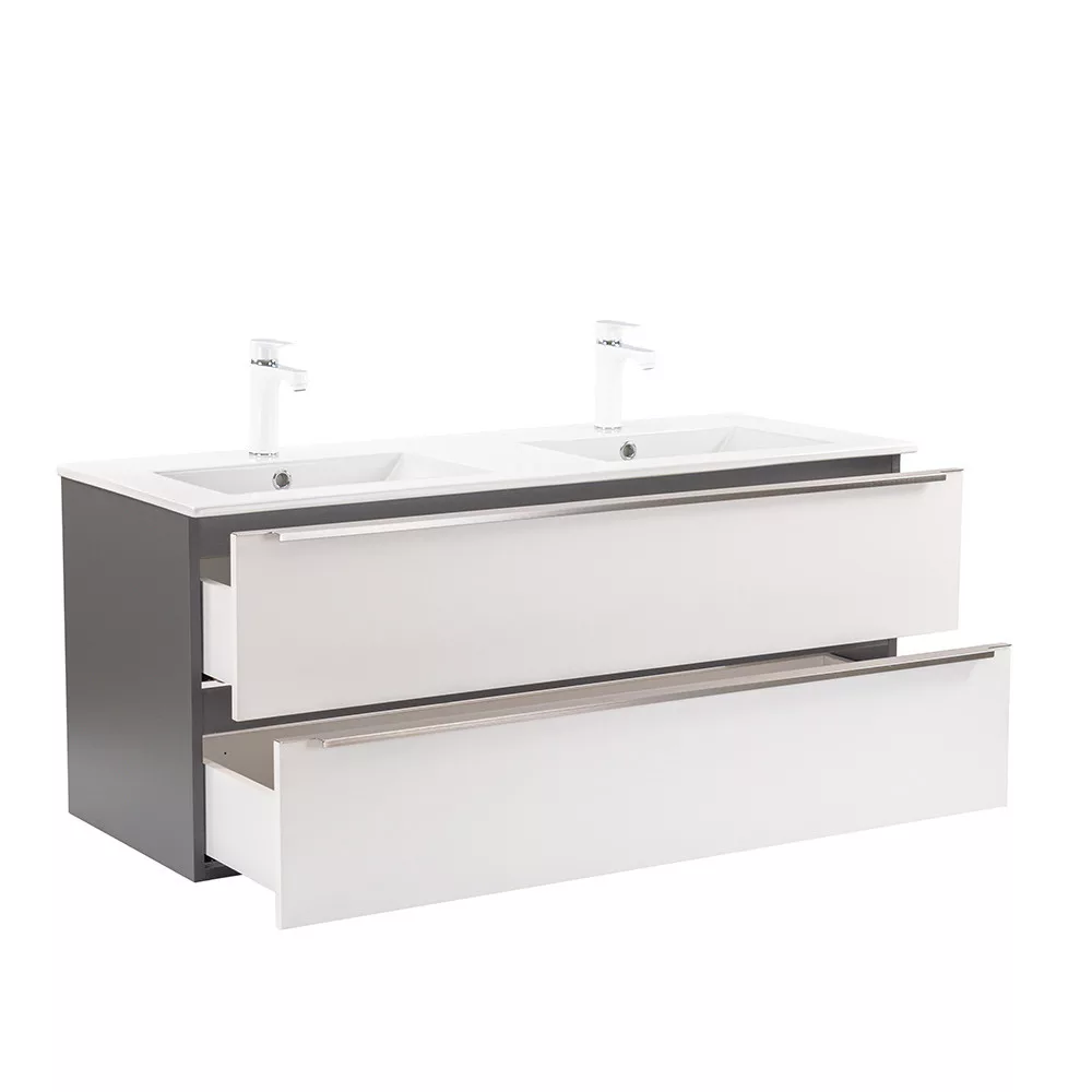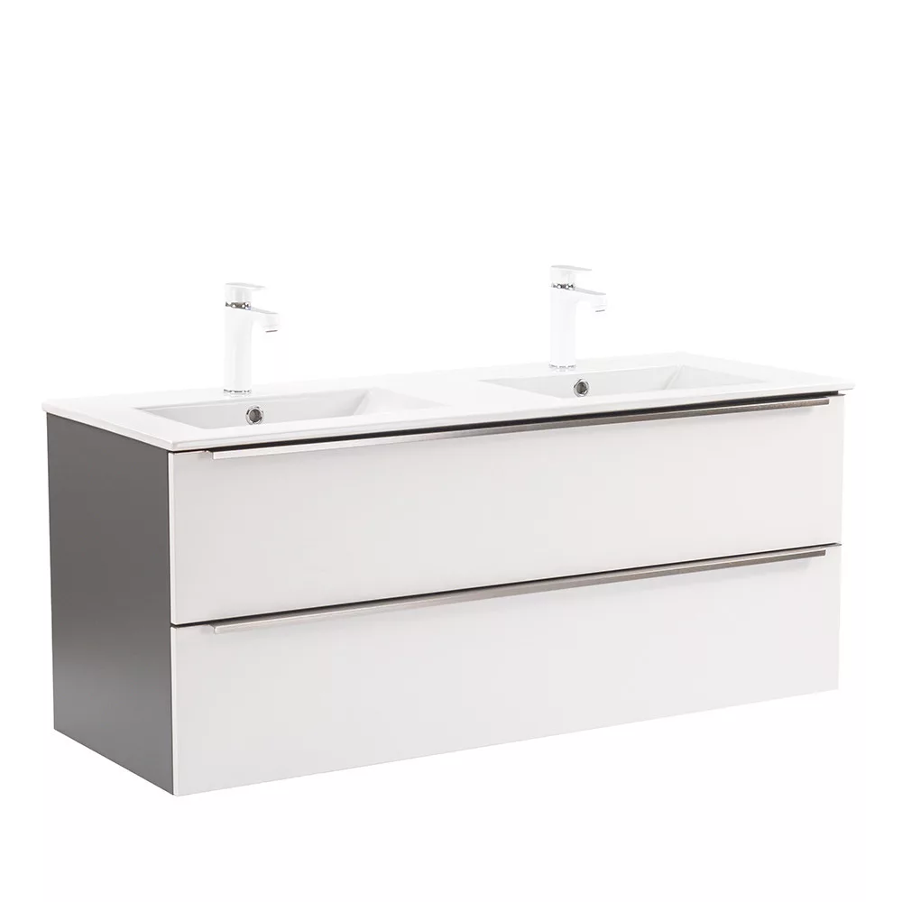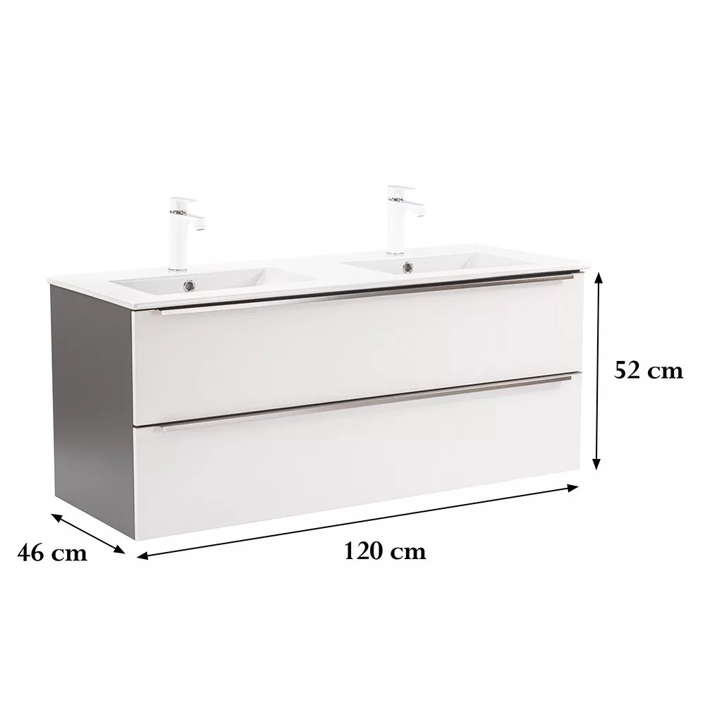 Das komplette Badmöbel Vario Trim 120 ist eine stilvolle und praktische Wahl für moderne Bäder. Durch seine kompakten Abmessungen ist er ideal für kleine bis mittelgroße Bäder. Das Griffprofil aus Metall sorgt für einen Patina-Effekt, während das anthrazit-weiße Design dem Raum einen eleganten Look verleiht. Der gedämpfte Schubladenverschluss und das hängende Design sorgen für Komfort und einfache Reinigung, während die hochwertigen Materialien eine lange Lebensdauer garantieren.